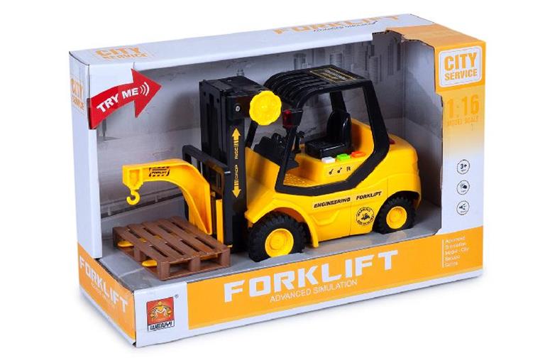 Carretilla elevadora de juguete es un modelo a escala 1:16 que funciona con fricción y cuenta con luces y sonidos para un juego más realista.